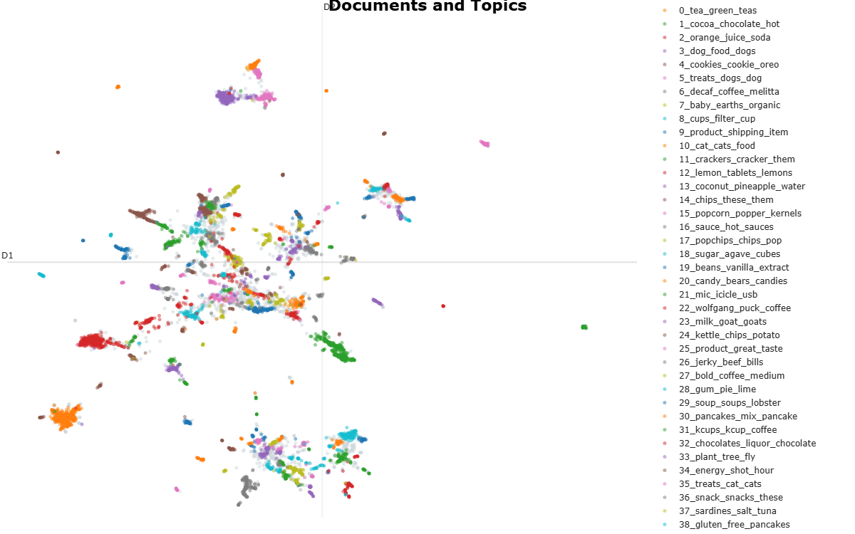 The sunburst chart is created by analyzing hidden state representations of the documents learned during the model training process. Modern NLP typically focuses on using deep neural networks to learn an embedding or hidden state representation of the language relationships within data. These deep neural networks are typically called Autoencoders and these hidden states are the crux of NLP analysis and modeling. An example of this hidden state for our Amazon reviews is shown below. This hidden state represents the contextual meaning of each document and helps us align each documents meaning to an area in space where similar documents are very close ot each other while disimilar documents are further apart.
